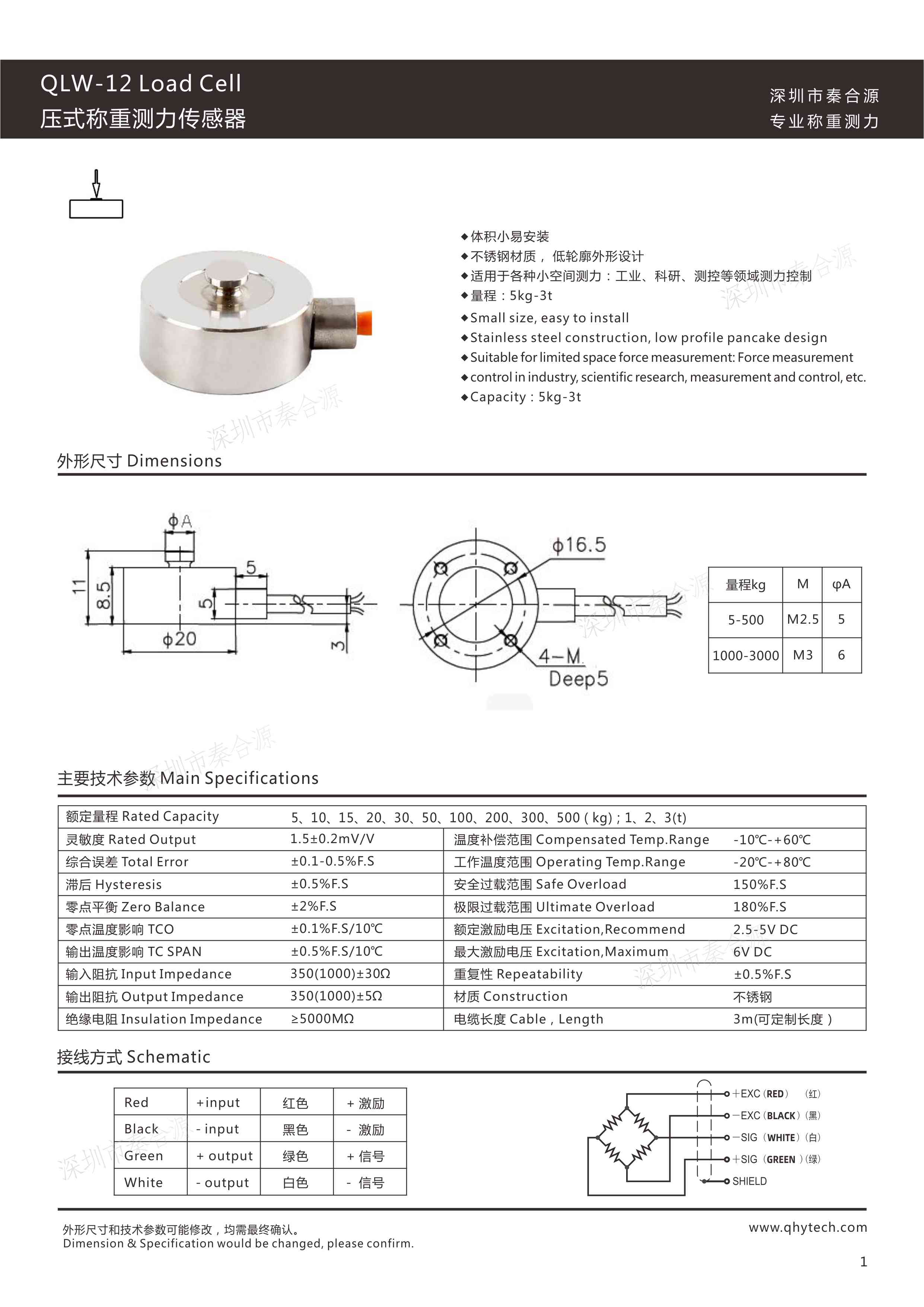 產品名稱:QLW-12小體積微型測力傳感器(5kg-3000kg),φ20mm
