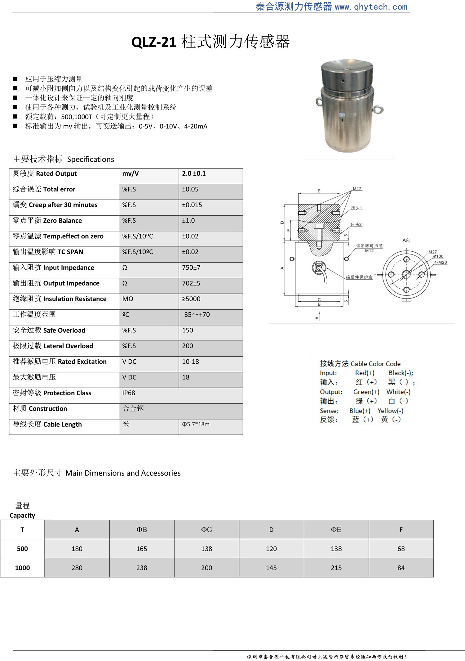 產品特點: 應用于壓縮力測量 可減小附加側向力以及結構變化引起的載荷變化產生的誤差 一體化設計來保證一定的軸向剛度 使用于各種測力,試驗機及工業化測量控制系統 額定載荷:500,1000T(可定制更大量程) 標準輸出為mv輸出,可變送輸出:0-5V、0-10V、4-20mA;